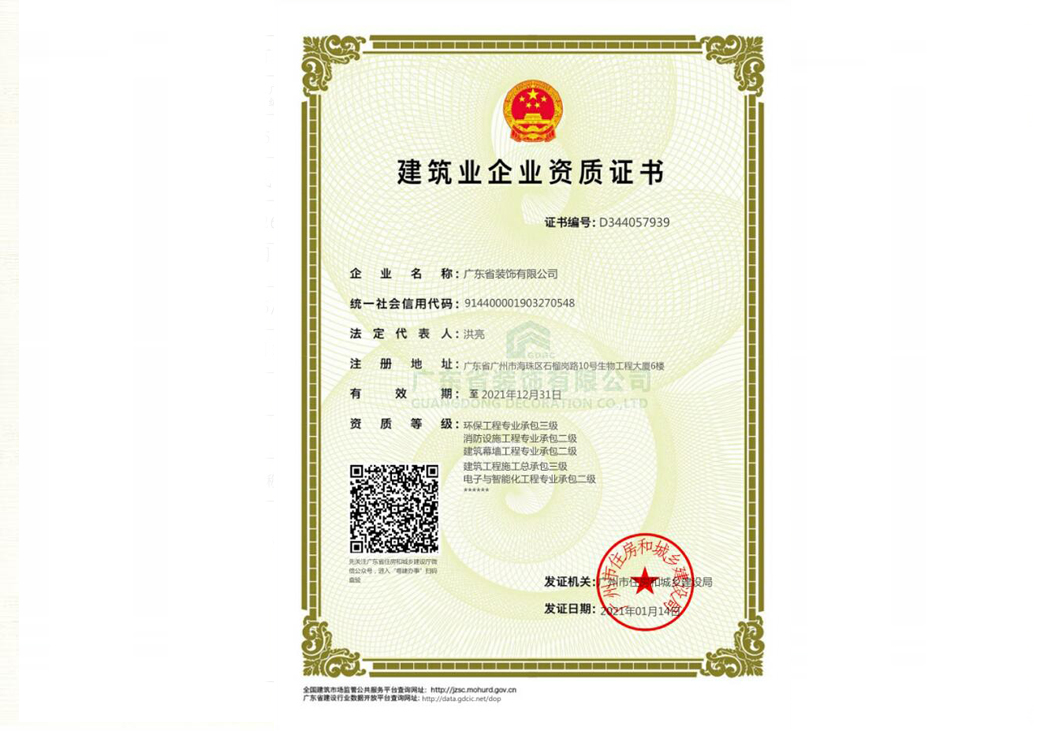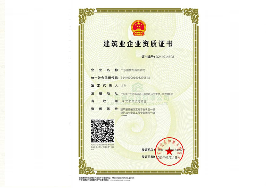 廣東省裝飾有限公司于2021年1月14日已完成“建筑業(yè)企業(yè)資質(zhì)證書”法定代表人變更,并由廣州市住房和城鄉(xiāng)建設(shè)局下發(fā)有效證書。