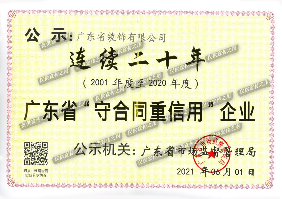 祝賀廣東省裝飾有限公司在2021年6月1日榮獲由廣東省市場監(jiān)督管理局頒發(fā)的“廣東省守合同重信用企業(yè)證書”。 同時廣東省裝飾有限公司一直保持著從2001年度至2020年度連續(xù)二十年榮獲該獎項。今后我司將再接再厲,繼續(xù)做好行業(yè)中的企業(yè)榜樣。