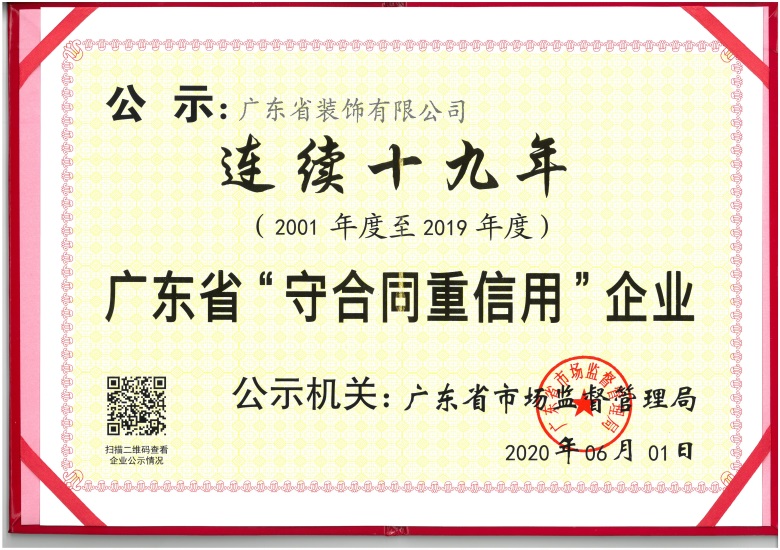 近期,由廣東省工商行政管理局組織開展2019年度廣東省“守合同重信用”企業(yè)評選活動圓滿結(jié)束。廣東省裝飾有限公司憑借科學(xué)的信用建設(shè)體系以及良好的誠信經(jīng)營形象,被授予 “連續(xù)十九年(2001年度-2019年度)廣東省守合同重信用企業(yè)”榮譽(yù)。