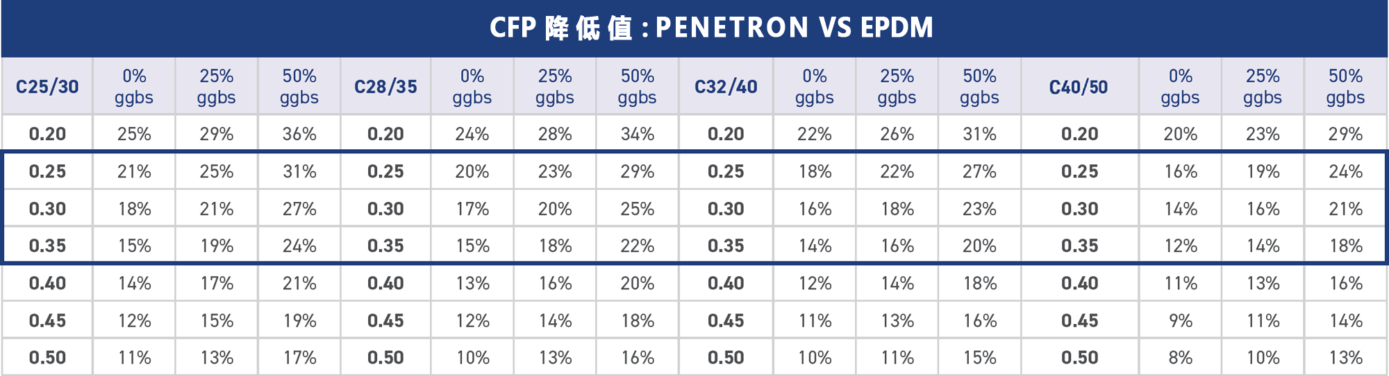按照結(jié)構(gòu)平均厚度0.25-0.35m計(jì)算每平方米混凝土的CFP,將PENETRON ADMIX 澎內(nèi)傳混凝土防水添加劑(PNC803)與上述表面處理方案進(jìn)行比較?,結(jié)果見(jiàn)右表。